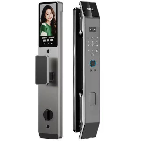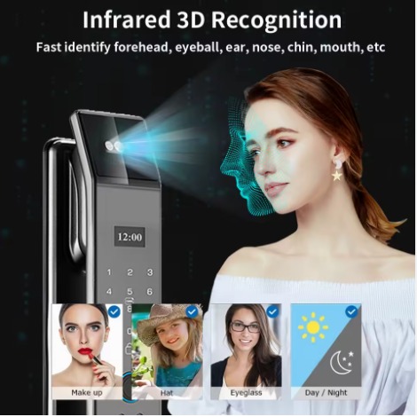 This smart lock offers 6 unlocking methods including 3D infrared facial recognition, fingerprint, password, IC card, mechanical key, and app with real-time intercom. It supports smartphone app control for remote unlocking, access history, and temporary passwords. Enhanced security features include a dual locking knob and compatibility with various door types. The built-in rechargeable battery provides 3-6 months of usage and includes low-power alerts and emergency power backup, and comes with a 3-year warranty.